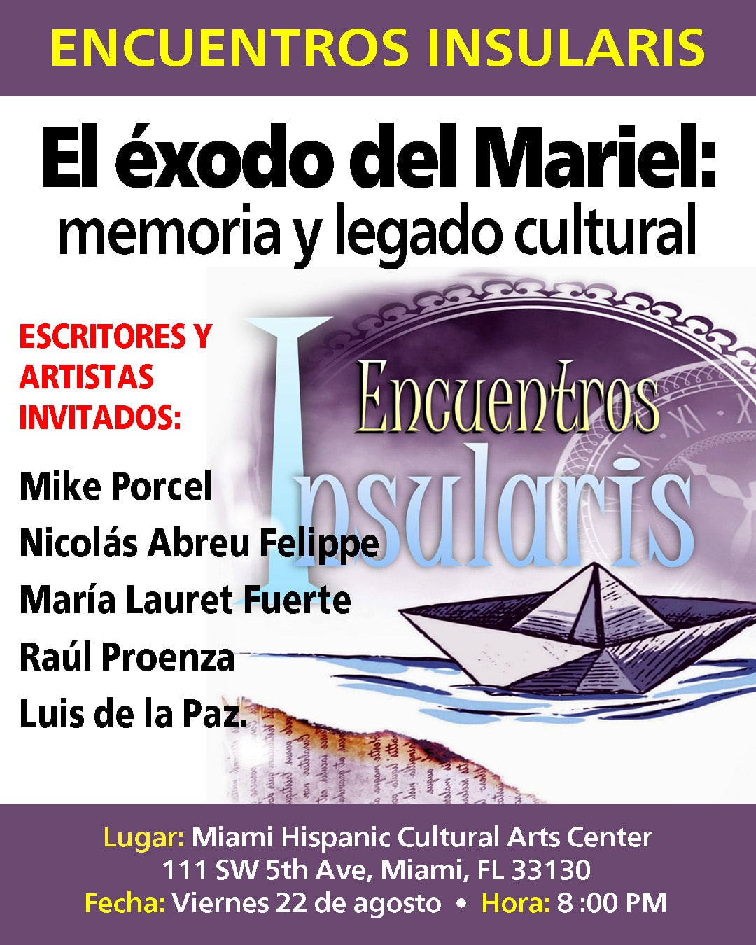 Encuentros Insularis, espacio para la divulgación de la cultura cubana exiliada e independiente dirigido por el poeta Joaquín Gálvez, recuerda el 45 aniversario del éxodo del Mariel  con un evento en el que participarán artistas y escritores que formaron parte de este hecho histórico: Mike Porcel, Nicolás Abreu Felippe, María Lauret Fuerte, Raúl Proenza y Luis de la Paz.