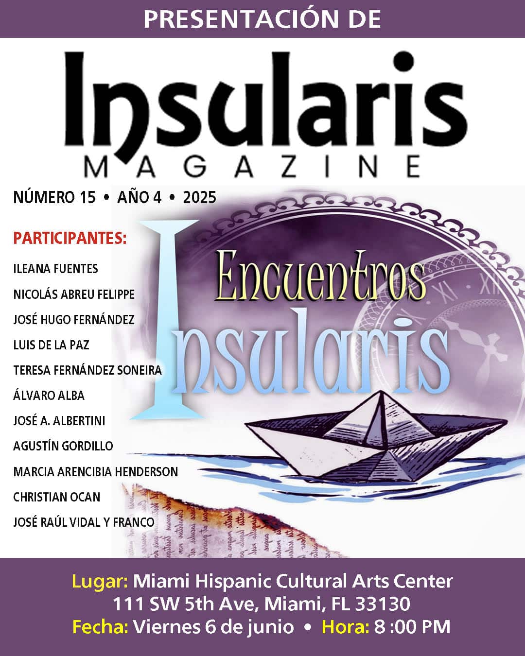 Encuentros Insularis, dirigido por el poeta Joaquín Gálvez, invita a la presentación del número 15 de la revista digital Insularis Magazine, con la participación de varios de los colaboradores de la entrega correspondiente a esta primavera.