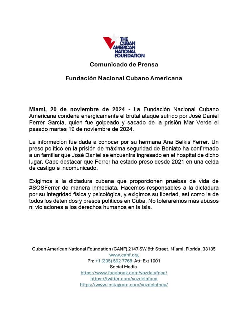 «Exigimos a Raúl Castro, Díaz-Canel y todos los integrantes de esa criminal dictadura que den muestras de vida de Ferrer de manera inmediata. Los hacemos responsables por su integridad física y psicológica, y a su vez les exigimos su libertad y la de todos los detenidos y presos políticos». Ana Belkis Ferrer García