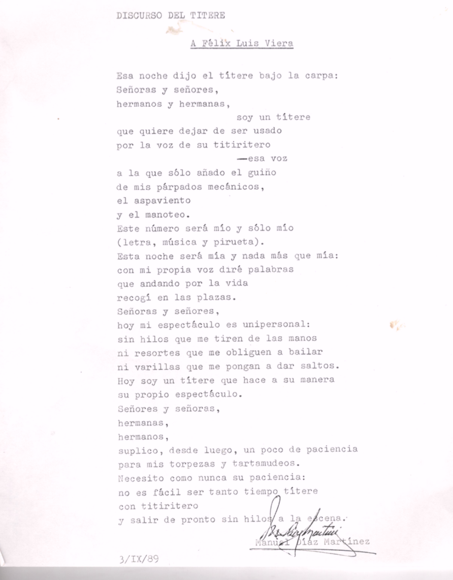 De una de aquellas tertulias surgió mi poema, dedicado a Manuel, “Los guerreros”, publicado en mi libro Y me han dolido los cuchillos y que reproduzco más abajo, y al cual él respondiera con “Discurso del títere”, que también reproduzco.